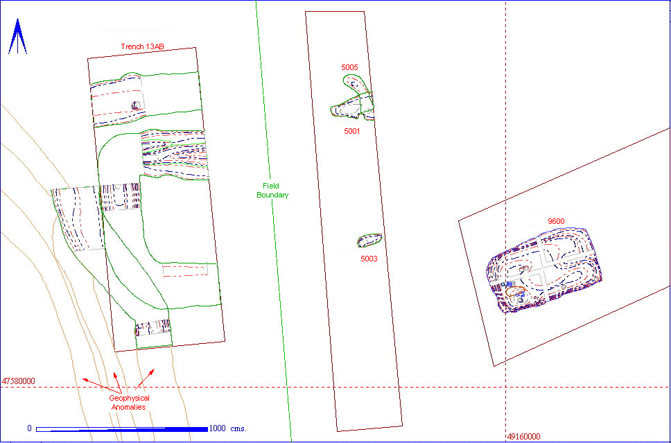 | 012AD05005 | DITCH CUT | LINEAR | 185 | 69 | 13 | U-SHAPED | TRUNCATED AND ROOT DISTURBED CUT OF POSS. SLOT RUNNING SW-NE. TERMINATES HALF WAY ACROSS TRENCH. APPEARS TO BE CUT BY 5001. |