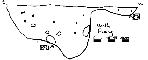 V-SHAPED NO FINDS. NO DAUB OR CHARCOAL FLECKING. NO PACKING EVIDENT ALTHOUGH POST PIPE MAY BE IN THE NORTH. CHALK INC 15% 0.5-2 CM IN DIAMETER.