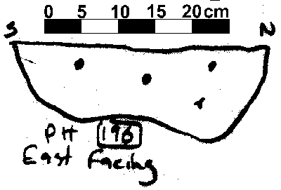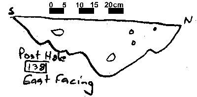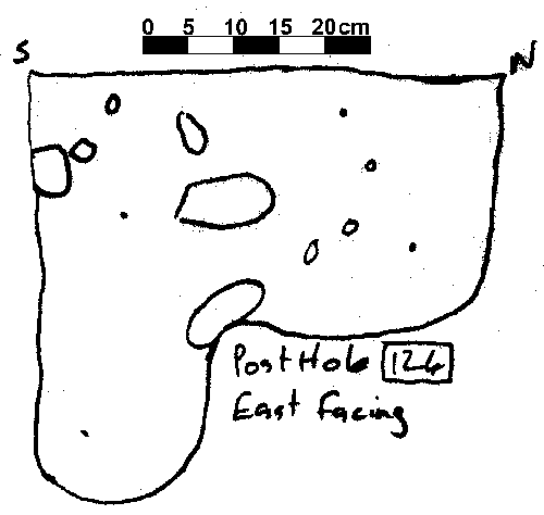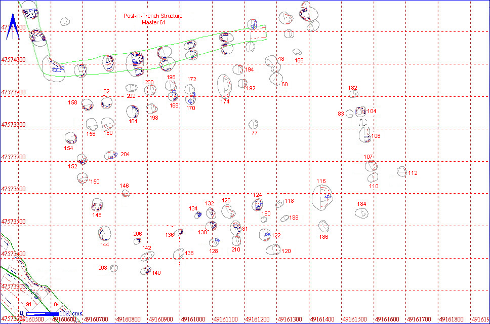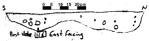 Based on typology, it can be speculated that this is a Early Saxon structure, replaced by the post in trench structure to the north sometime during the Middle Saxon period. Due to time constaints at the end of the 1995 season, not all of the post hole sections were drawn, although a number (28) that showed evidence of post packing or a post pipe were drawn.