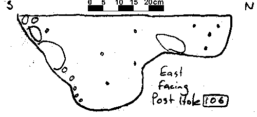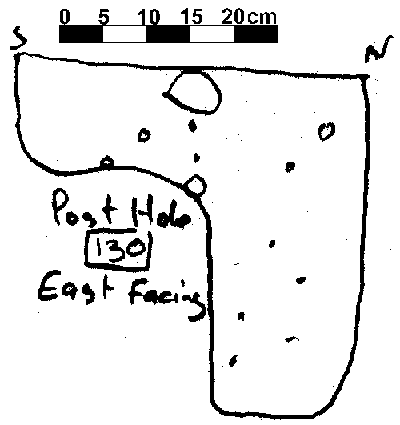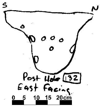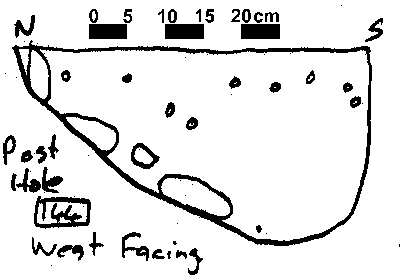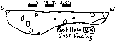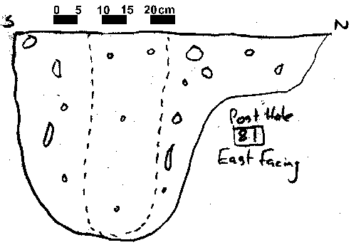 Based on typology, it can be speculated that this is a Early Saxon structure, replaced by the post in trench structure to the north sometime during the Middle Saxon period. Due to time constaints at the end of the 1995 season, not all of the post hole sections were drawn, although a number (28) that showed evidence of post packing or a post pipe were drawn.