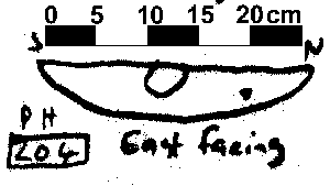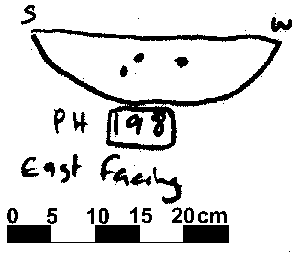 V-SHAPED | NO FINDS. NO DAUB OR CHARCOAL FLECKING. NO PACKING EVIDENT ALTHOUGH POST PIPE MAY BE IN THE NORTH. CHALK INC 15% 0.5-2 CM IN DIAMETER. |