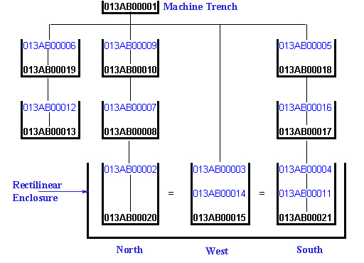 This trench, along with 13AA and 13AC, was excavated by machine on the 3rd August 1995. It was sited specifically to investigate the unusual rectilinear anomaly seen on the geophysical survey Detail view of rectilinear anomaly  data. As it happened, the anomaly was caused by a number of recuts (at least 3, 013AB00020, 013AB00008 and 013AB00010) of the feature, the southern and western part of which was in turn cut by one of the boundary ditches (itself in two phases, 013AB00017 and 013AB00018).